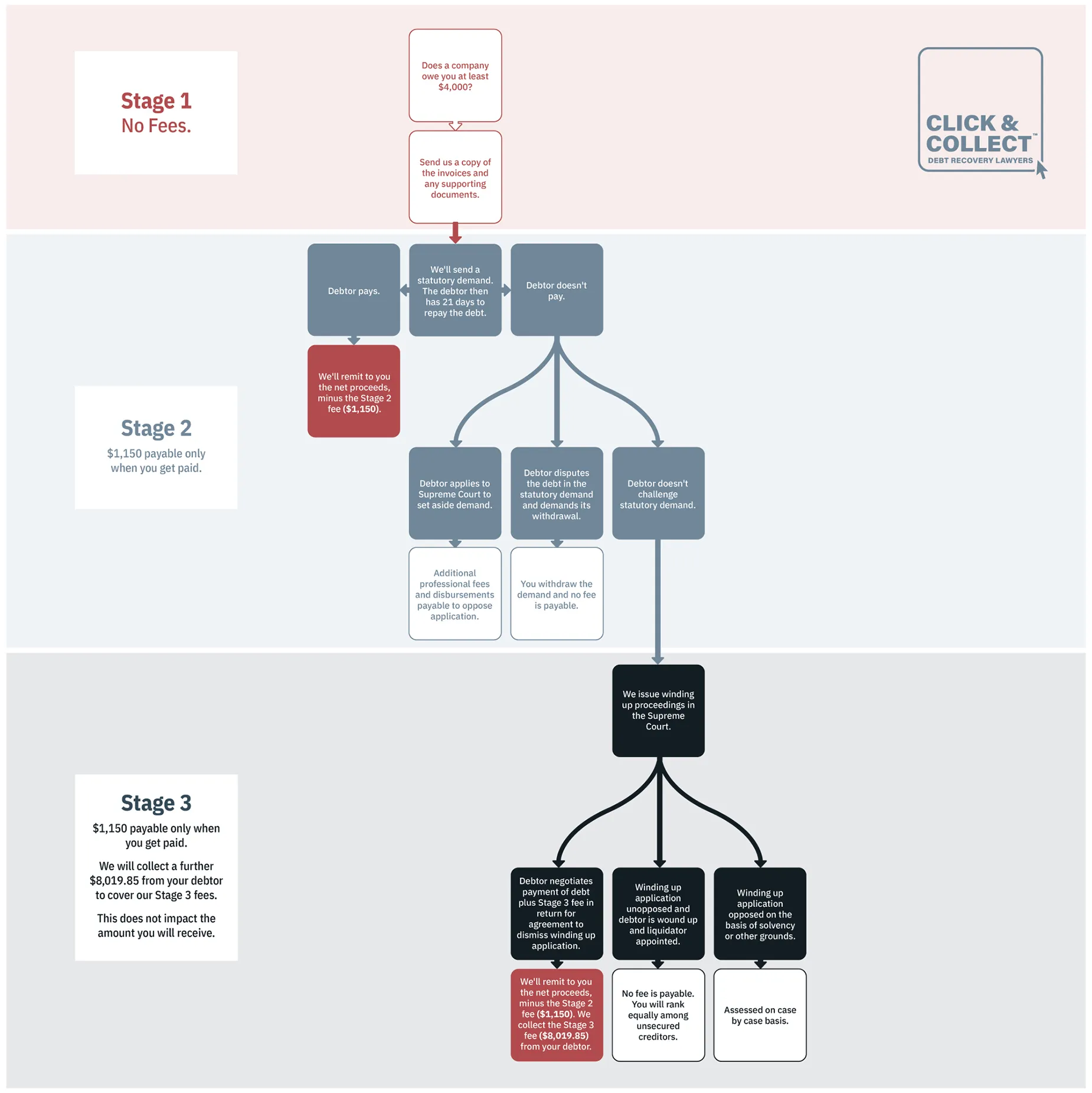 Our interactive flowchart walks you through the process step by step – from submitting your claim to legal enforcement. See exactly what happens at each stage, including costs and timelines, so you know what to expect. No confusion, no hidden fees – just a clear, effective path to getting paid.